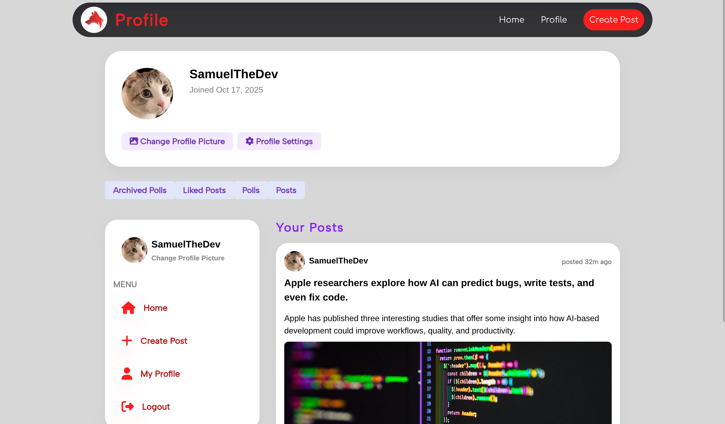 Social posting, interactive polls, user profiles, real-time engagement, file uploads, responsive design.
